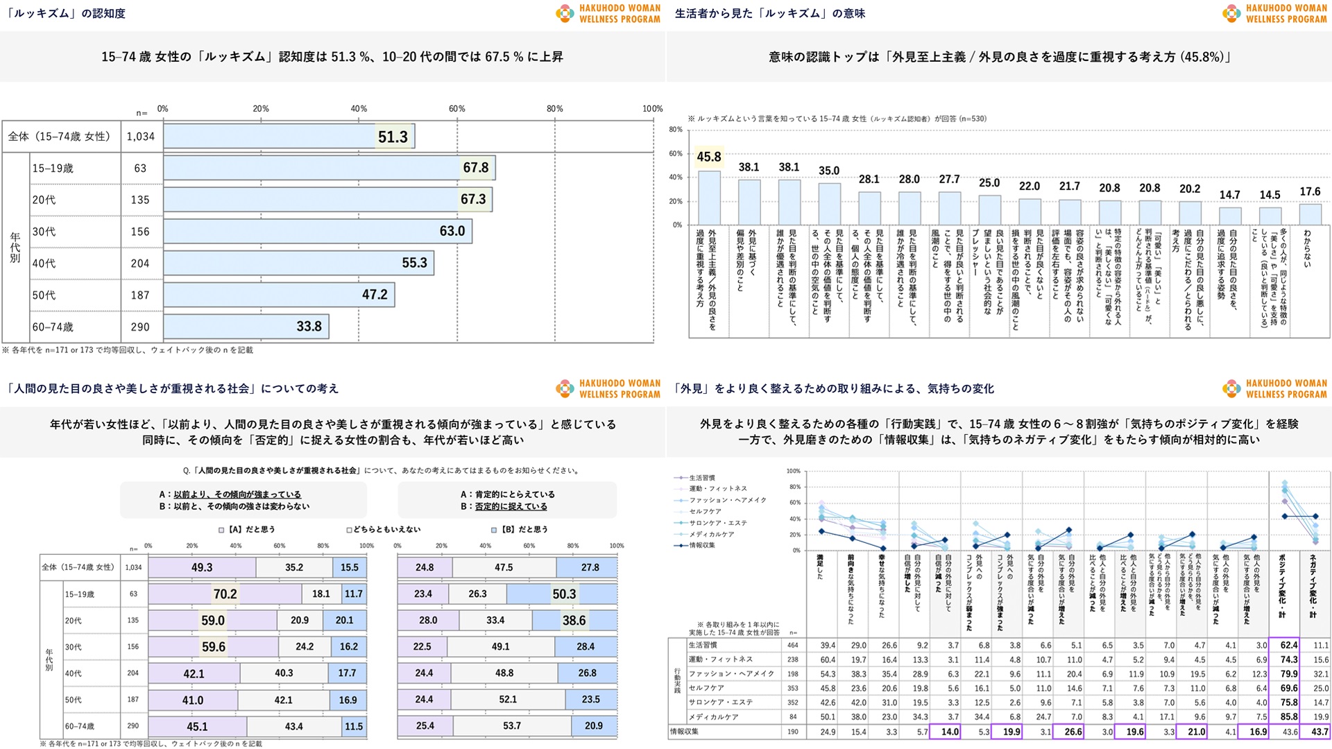 女性の心身の健康課題に関わる事業をサポートする博報堂 Woman Wellness Program は、15–74歳の女性1,034名を対象に「女性の外見とのつきあい方とルッキズムに関する意識調査」を実施しました。レポート公開に先立ち、主要な調査結果を調査リリースとしてご共有いたします。